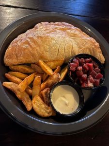 This consists of meatless beef crumbles and vegetable stew hand pie. This comes with creamy stone ground mustard dipping sauce, apple beet salad, and wedge fries.