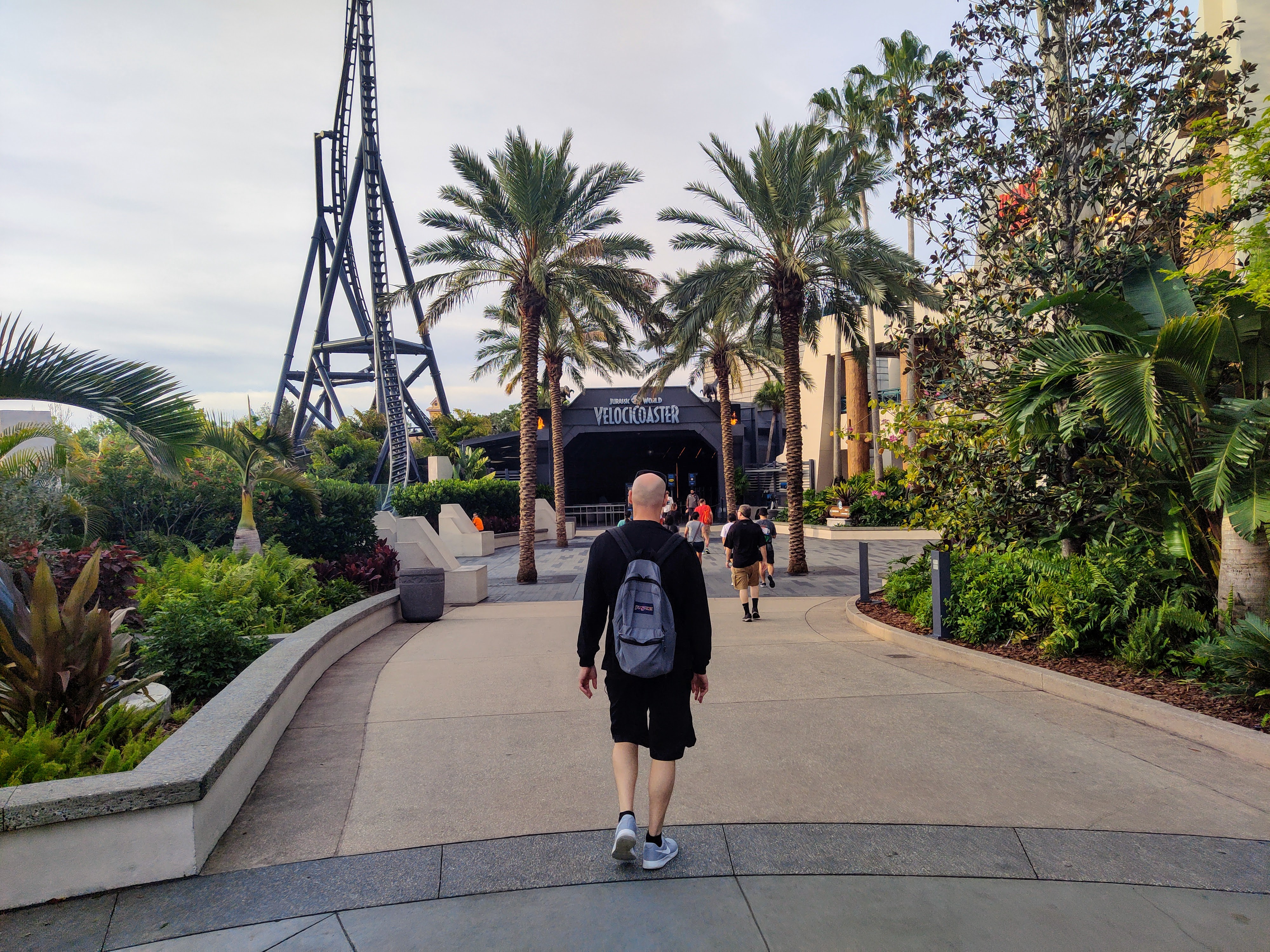 Metal detectors & compulsory storage: For safety, VelociCoaster is one of the Universal Orlando Resort coasters with metal detectors and a strict “no loose articles on the ride” policy. Everything must be stowed.