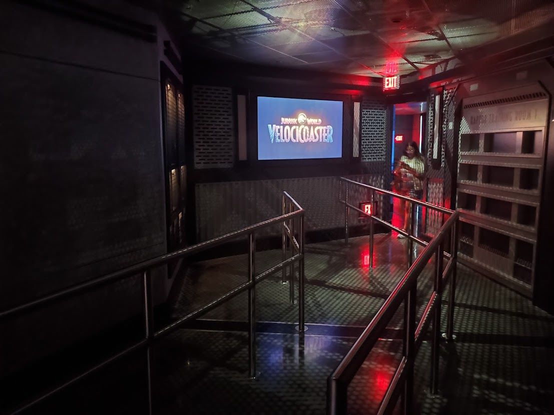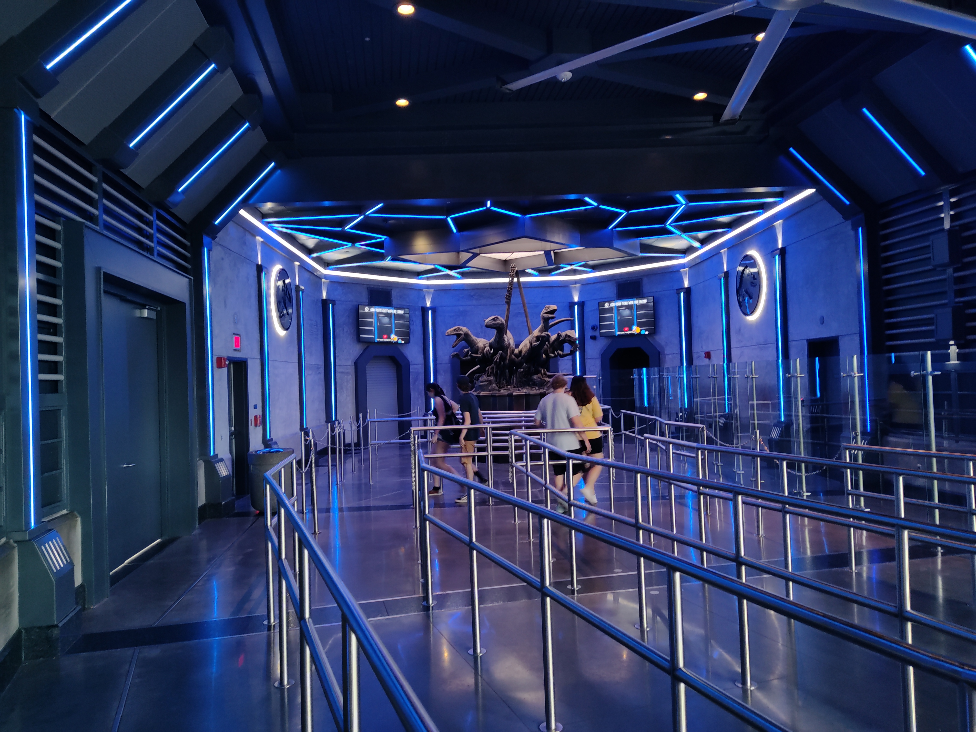 - Queue & pre-show — The queue is heavily themed: dinosaur paddock vibes, mock research windows, and pre-show videos narrated by Jurassic World characters. There are animatronics and several photo/FX moments that build the story of being chased by velociraptors. The queue takes you inside the Discovery Center-adjacent building before you reach the metal detectors and locker area. The queue shown above is the indoor portion of the queue. On busy days, guests may start in the outdoor queue portion.